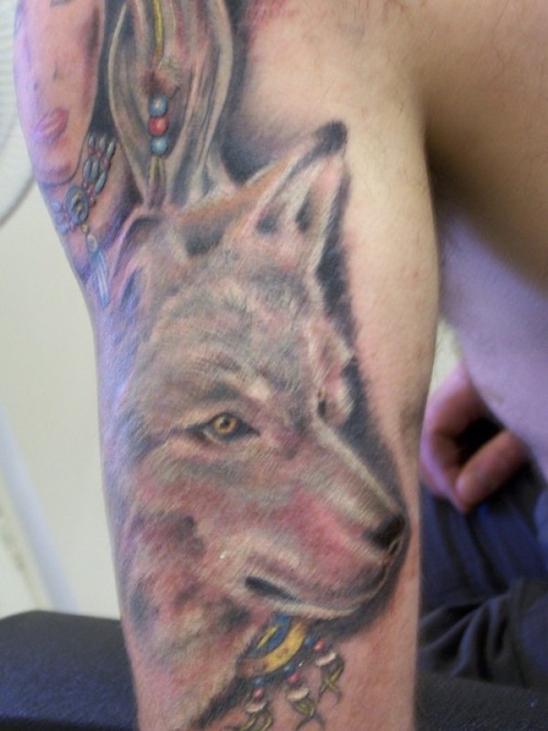 肩部彩色女子与狼头纹身图案