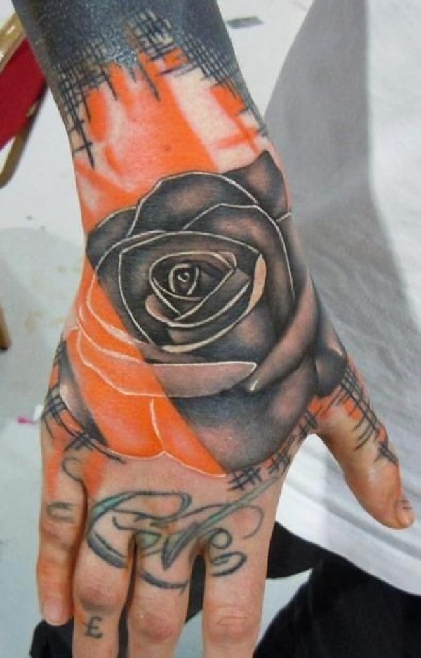 手背灰色颓废风玫瑰花纹身图案