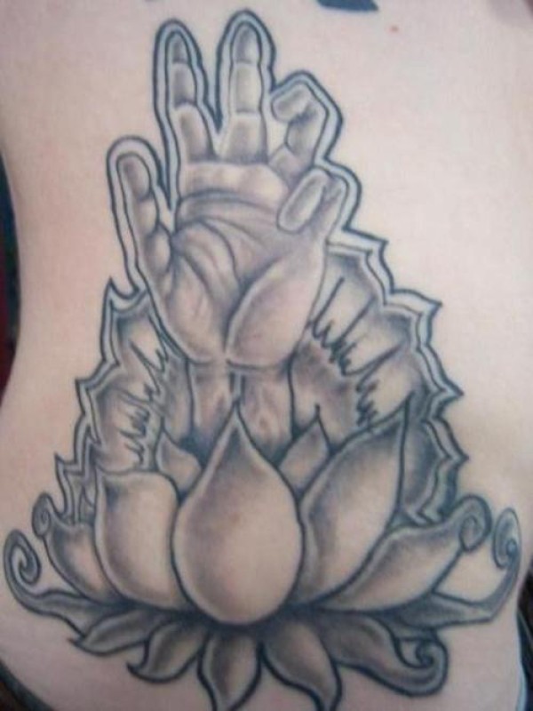 腰部灰色莲花与人的手纹身图案