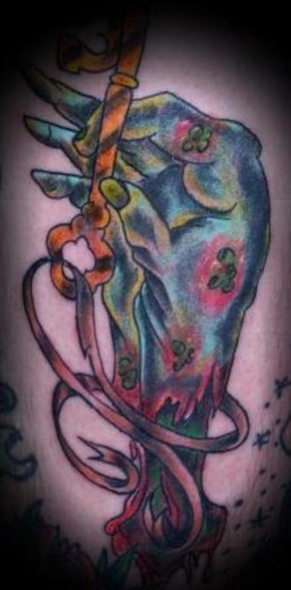 腿部彩色僵尸手与钥匙纹身图案