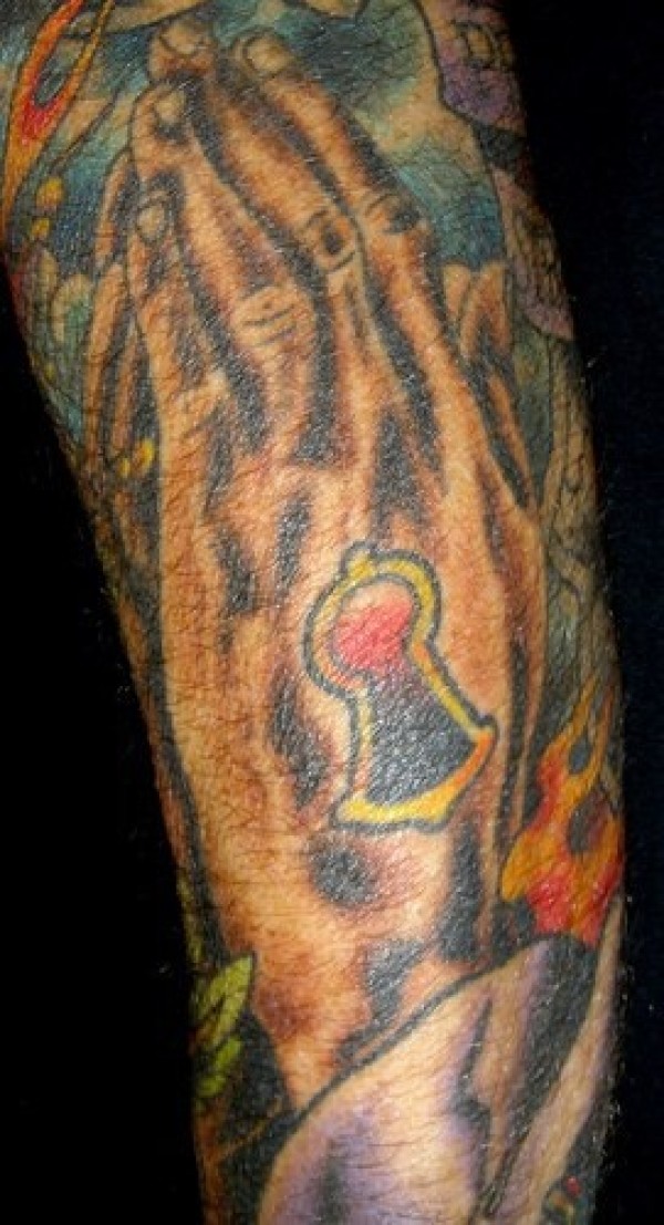 手臂彩色钥匙孔祈祷手纹身图案