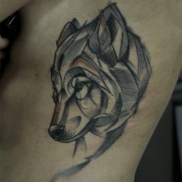 腰侧彩色几何风格狼头纹身图案
