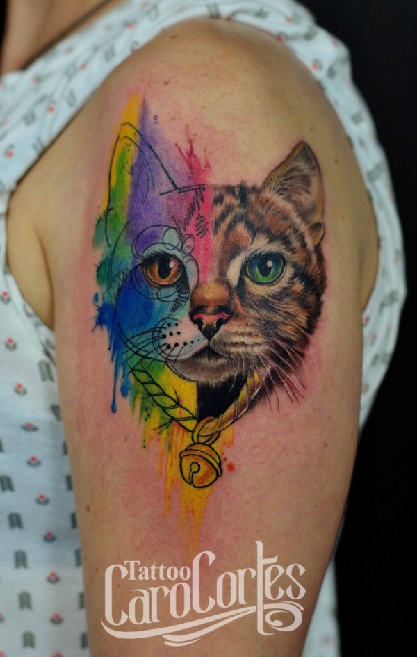 肩部半现实半水彩猫头纹身图案