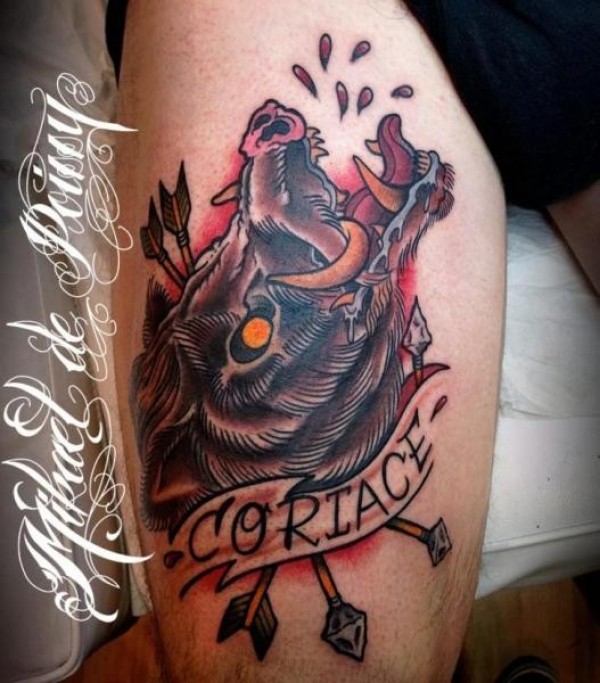 腿部彩色血淋淋的野猪头纹身图案