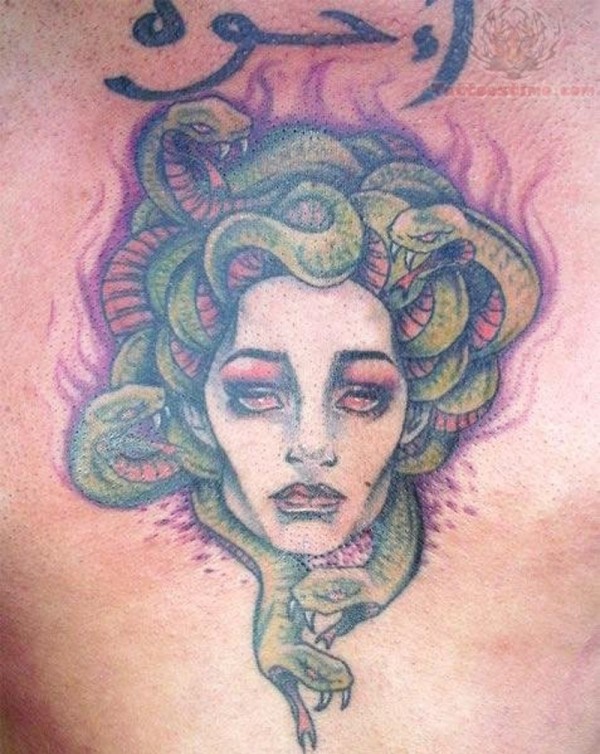 胸部水彩色美杜莎头像纹身图案