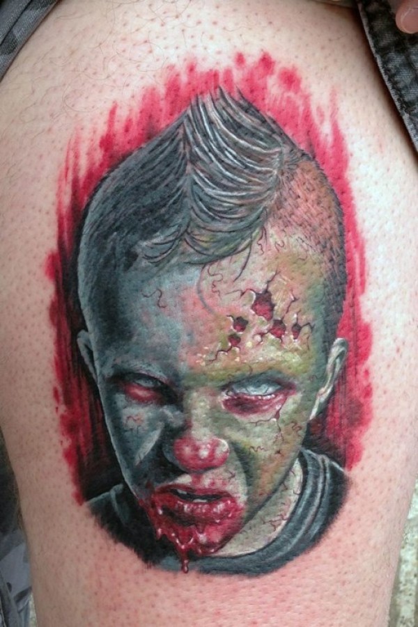 腿部彩色毛骨悚然的血腥男孩头部纹身