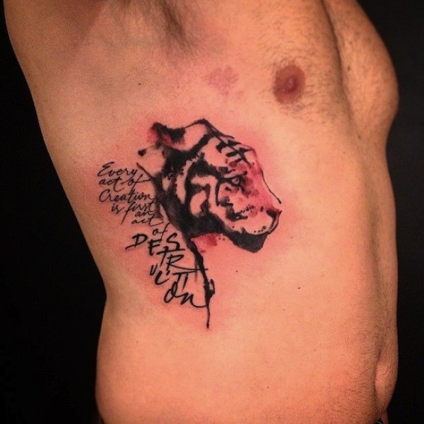 腰侧黑色简约老虎头与字母纹身