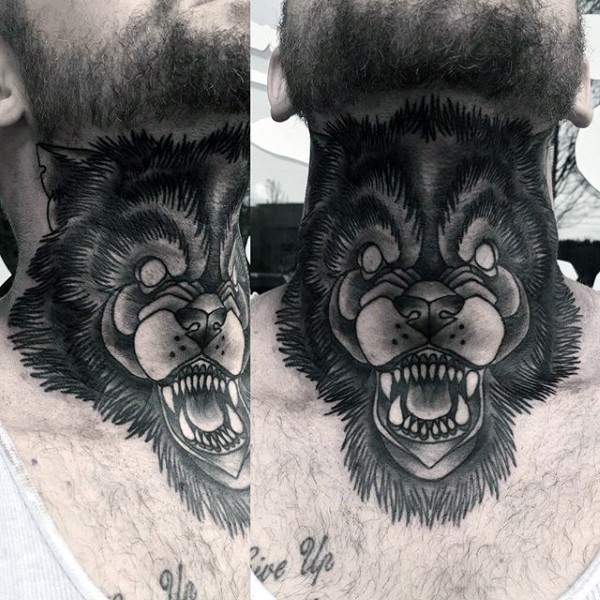 颈部深色愤怒疯狂的狼头纹身图案