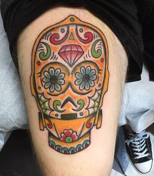 腿部彩色墨西哥风格糖骷髅纹身图案