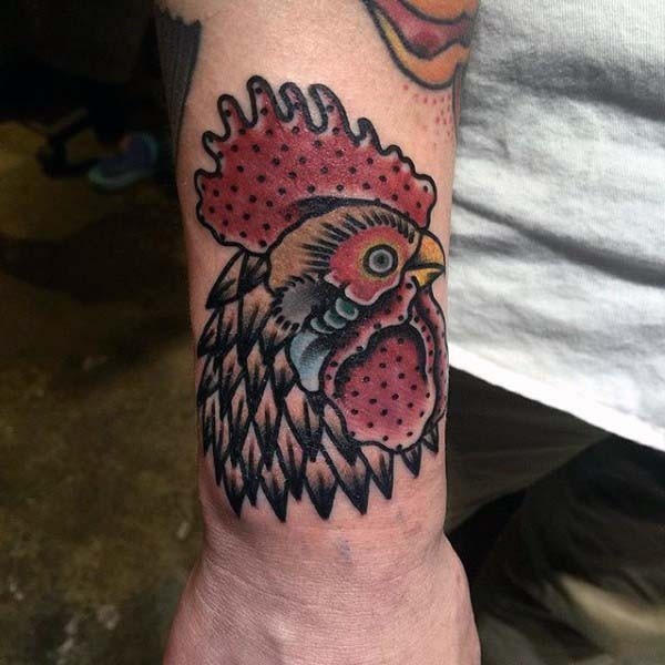 手腕彩色公鸡头部纹身图案