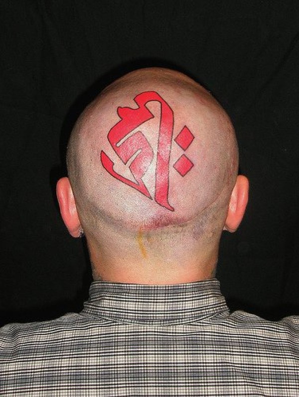 头部红色标志的文字符号纹身图案