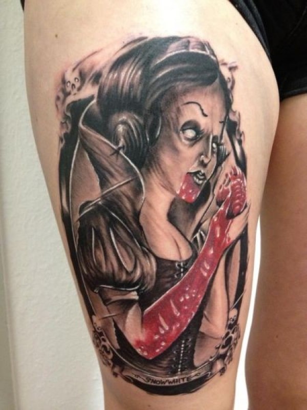 腿部恐怖风格彩色血腥女人与心脏纹身