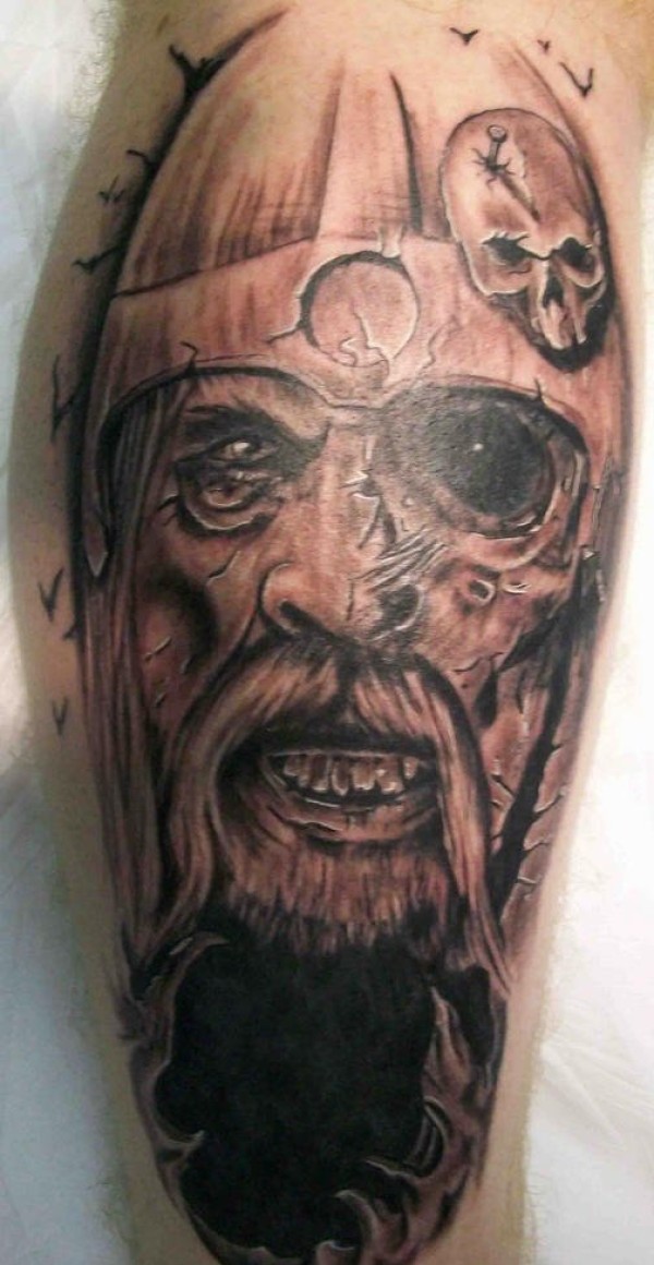 腿部棕色维京战士头像纹身图片