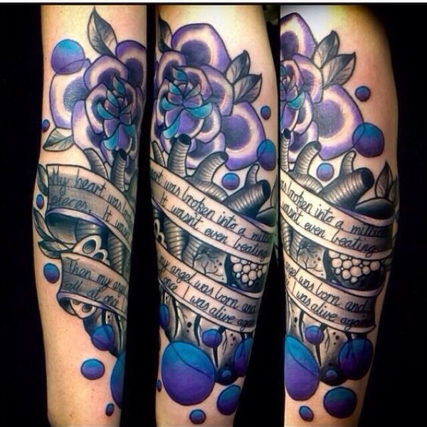 腿部彩色新学校风格色紫玫瑰与心脏纹身