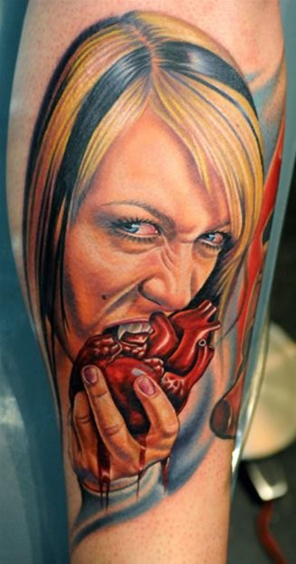 腿部逼真的彩色毛骨悚然吸血鬼纹身