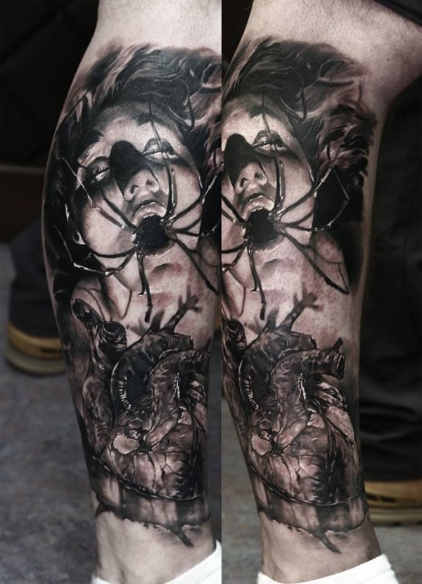 腿部令人毛骨悚然的女人与人类心脏纹身