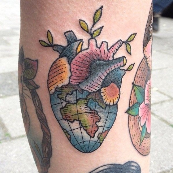手臂彩色带叶子的心脏纹身图案