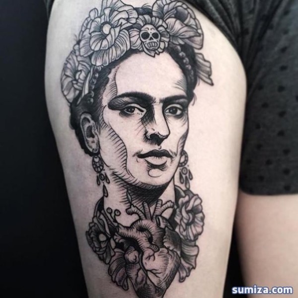 腿部黑色雕刻风格的女人肖像与人心脏纹身