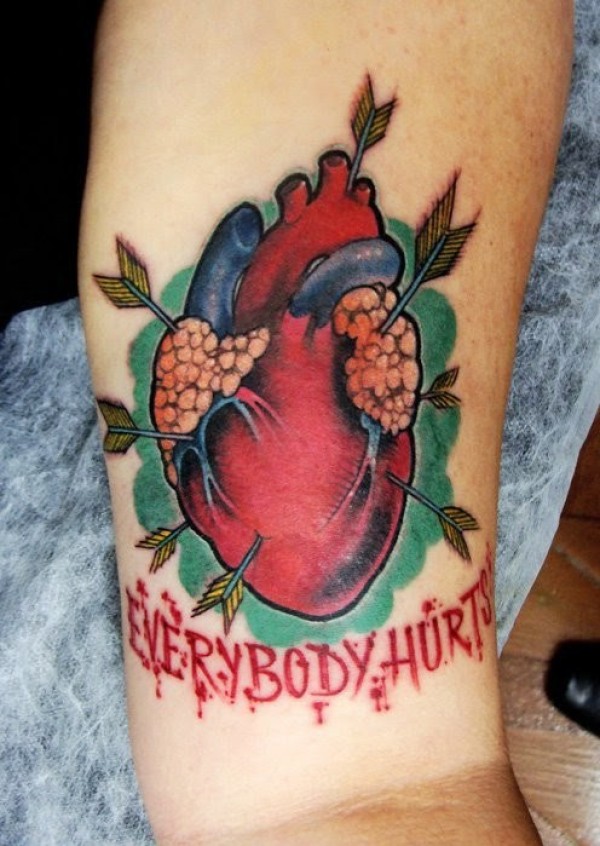 腿部复古风格的彩色心脏箭纹身图片