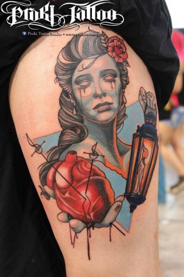 腿部新学校风格彩色神秘的哭泣的女人纹身