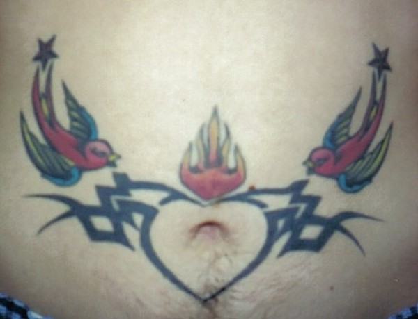 腹部彩色燕子与爱心图腾纹身图片