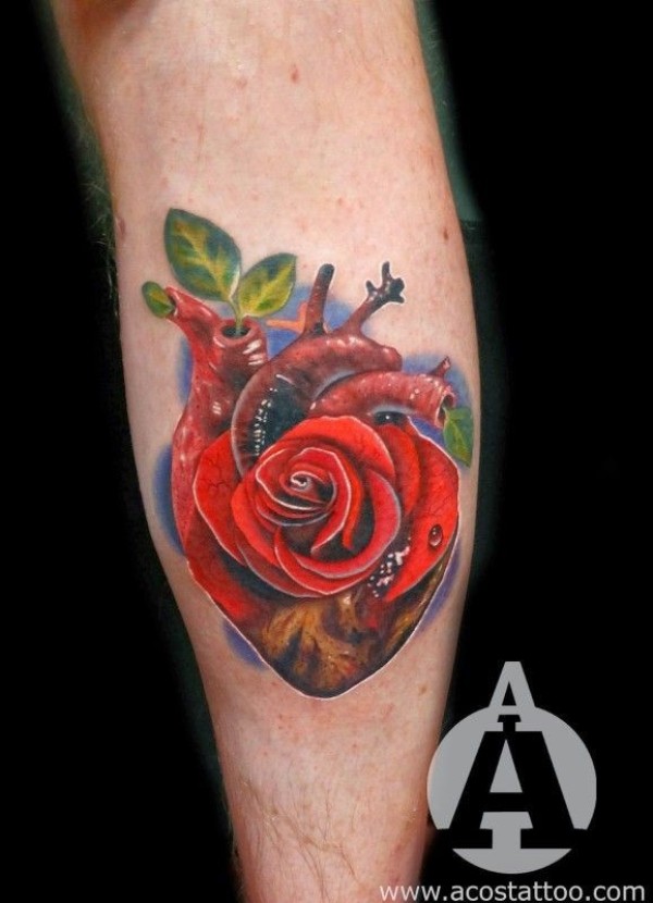 腿部色彩鲜艳的玫瑰心脏纹身图片