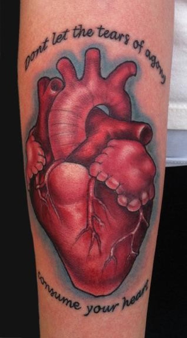 手臂彩色逼真的心脏与英文纹身图案