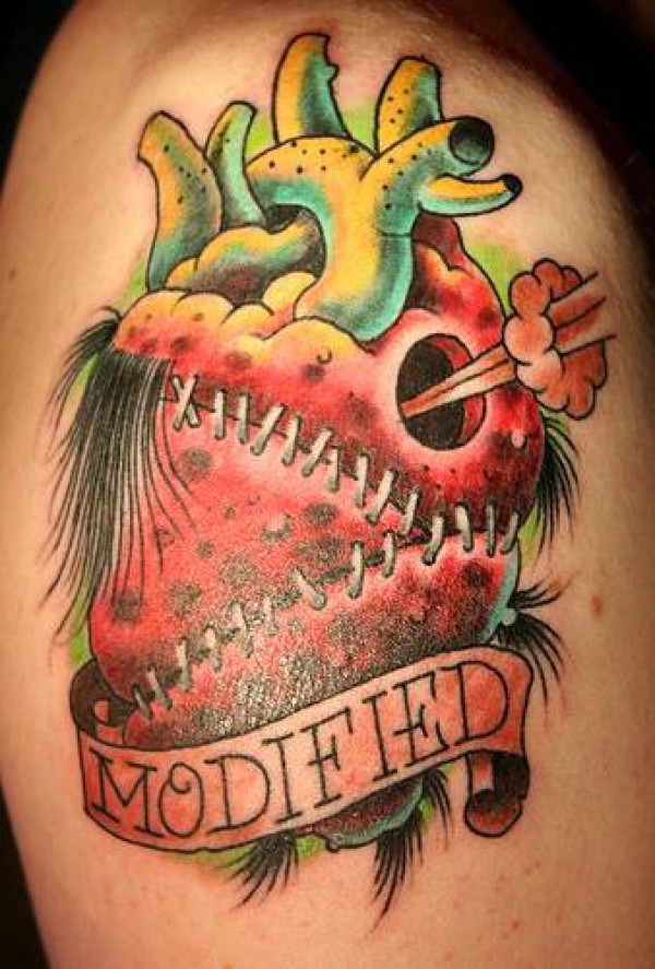 肩部彩色僵尸心脏与字母纹身图片