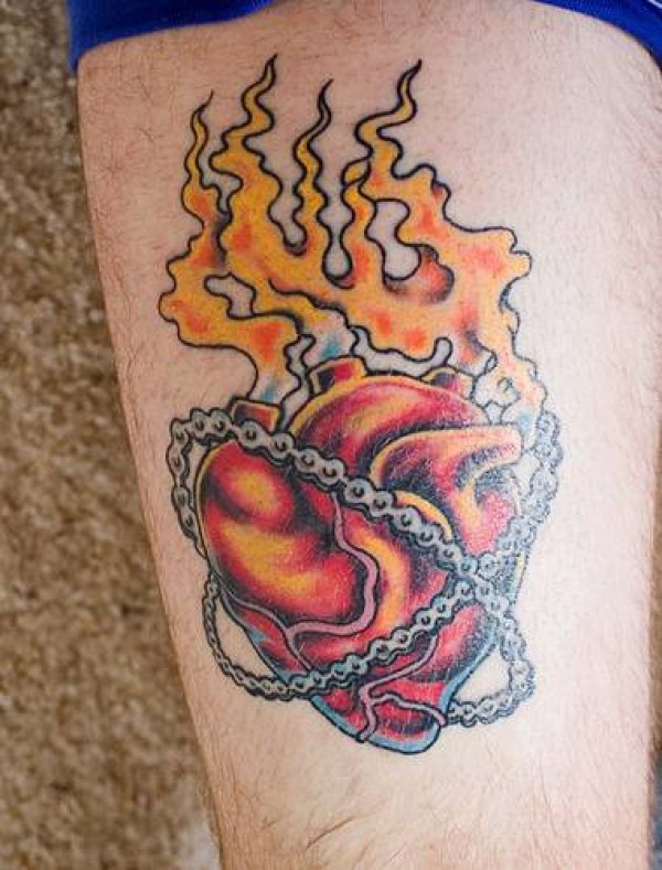 腿部彩色火焰之心锁链纹身图片