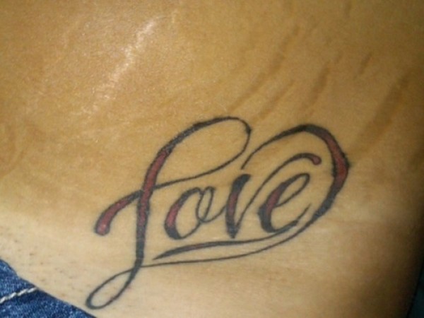 腰部彩色爱字在心形里的纹身图片