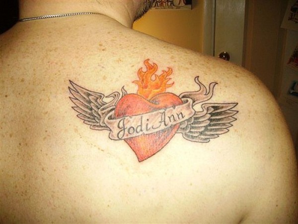 肩部彩色翅膀与爱心纹身图案