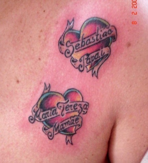 肩部彩色爱心与英文字母纹身图案