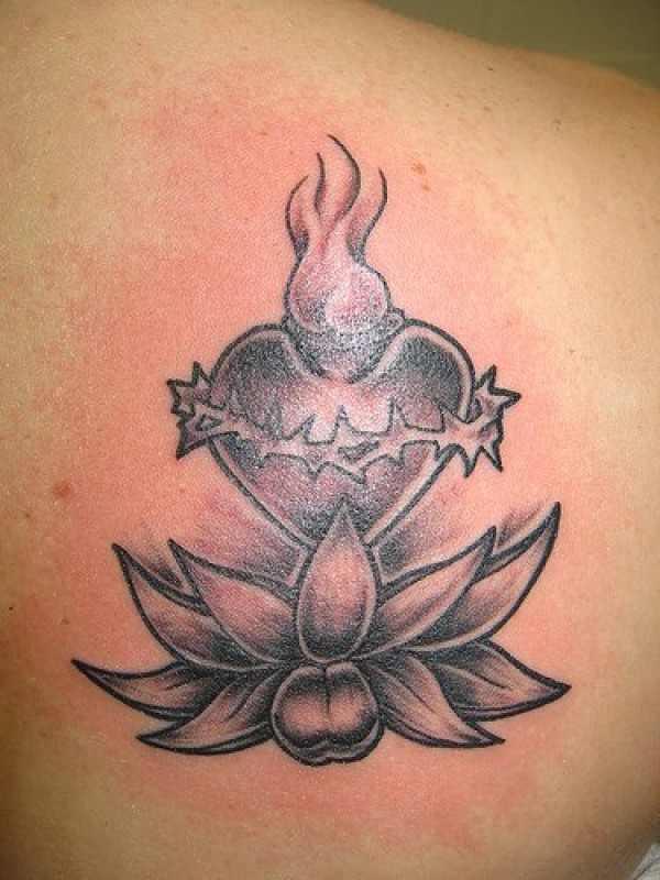 肩部灰色莲花和神圣的心纹身