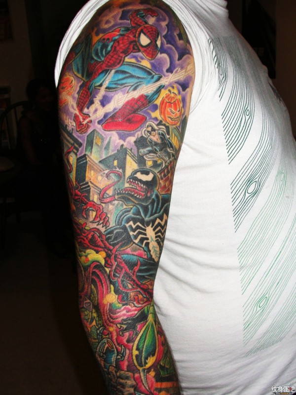 蜘蛛侠等美国漫画主题的花臂纹身图案