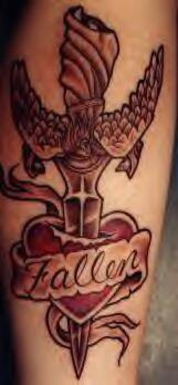 腿部棕色剑与爱心纹身图案