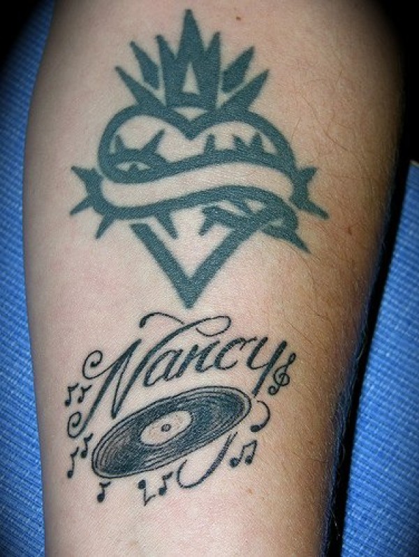腿部罐装音乐和爱心纹身图案