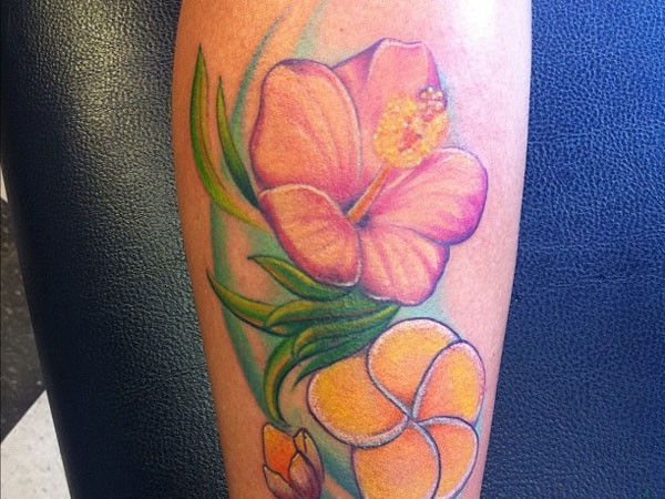 腿部彩色好看的木槿花纹身图案