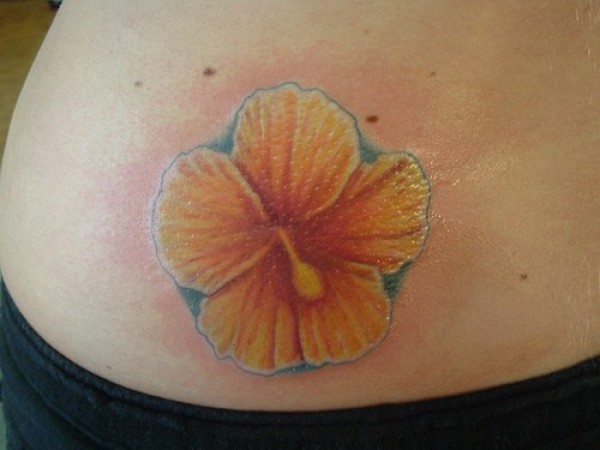 腰侧彩色黄色木槿花纹身图片
