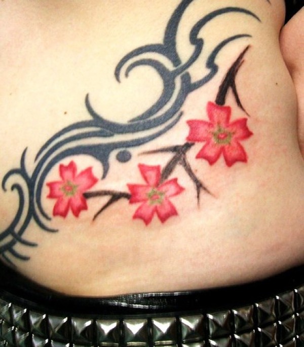 腹部彩色漂亮的花朵图腾纹身图片