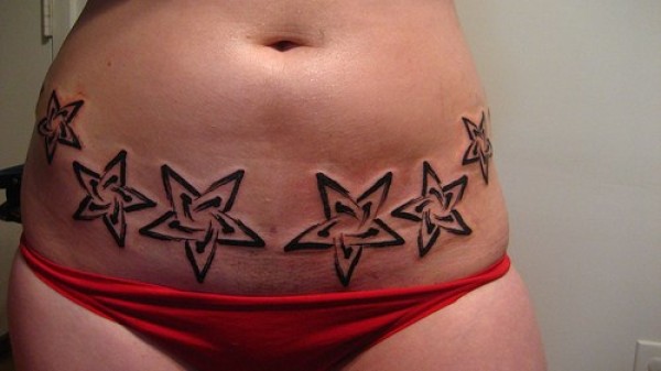 女性腰部黑色五角星纹身图案