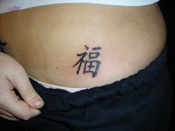 腰部黑色汉字纹身图案