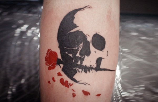 腿部彩色个性人头骨与玫瑰纹身