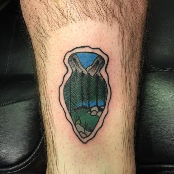 腿部简单彩色古代武器程式化与山林纹身