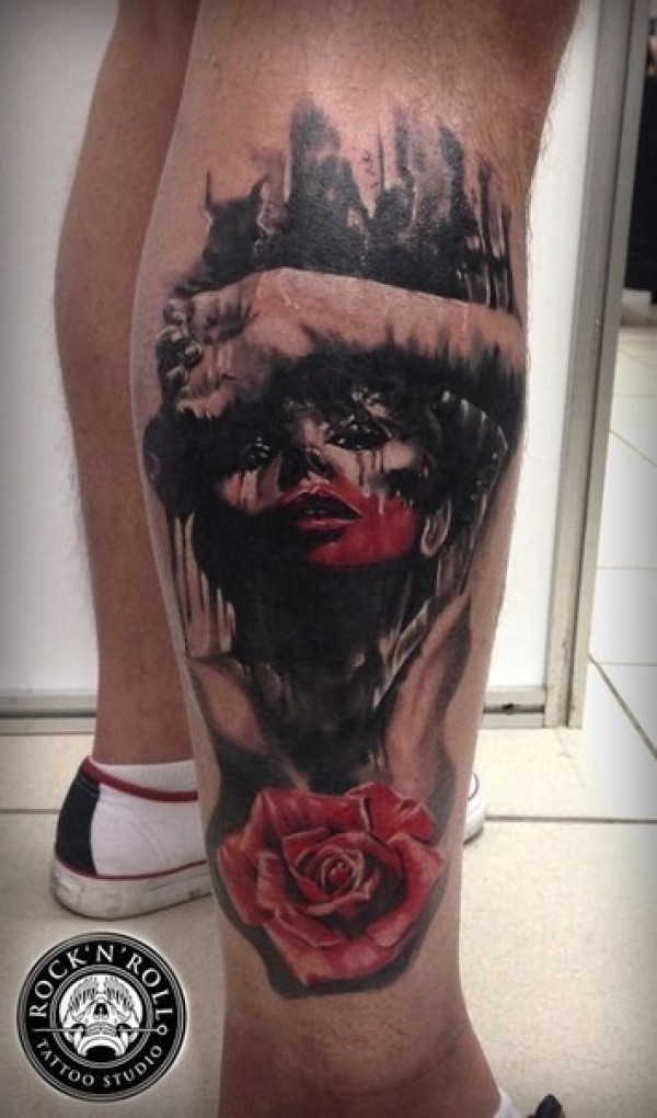 腿部彩色恐怖风格血腥妇女与玫瑰纹身