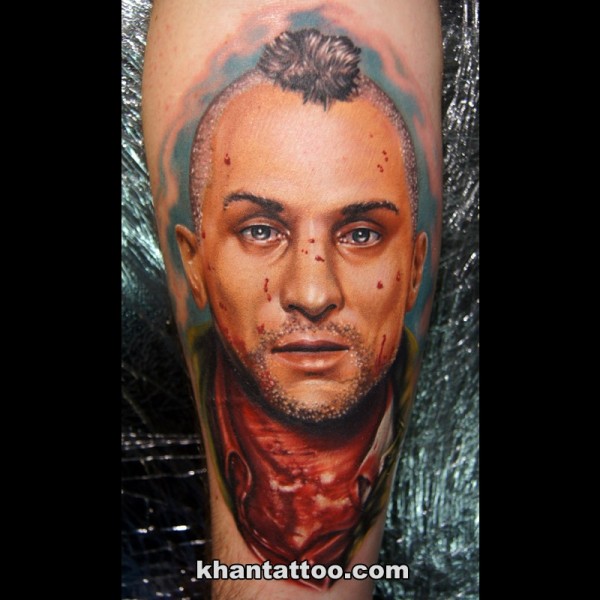 腿部恐怖风格彩色血腥男子肖像纹身图片