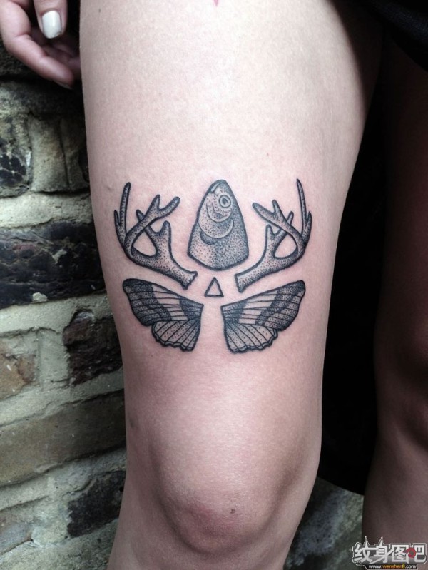 鱼头,鹿角和蝴蝶翅膀纹身图案