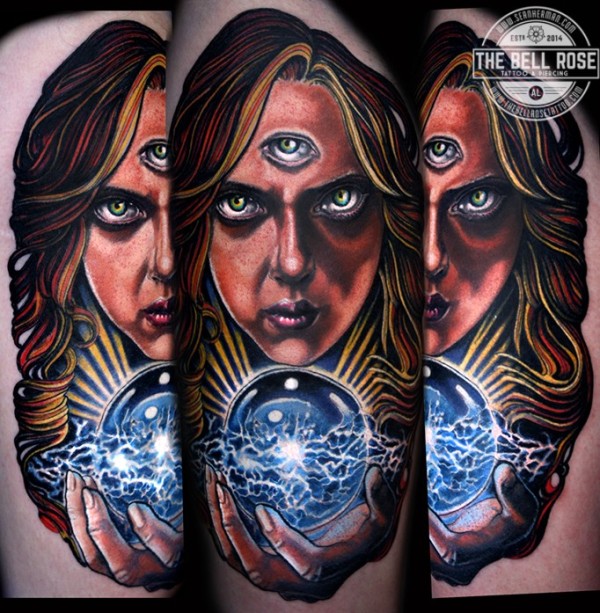腿部恐怖风格色彩色神秘女人纹身图片