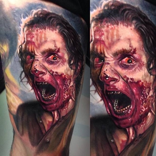 腿部彩色恐怖令人毛骨悚然的男子肖像纹身