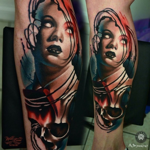 腿部彩色恐怖风格女人与恶魔纹身