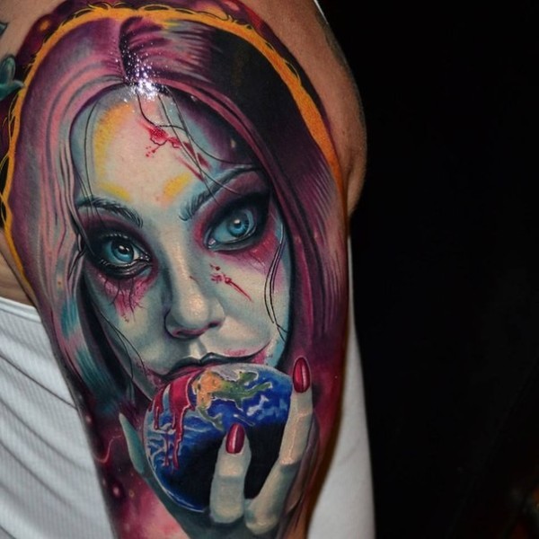 肩部彩色恐怖风格令人毛骨悚然的吸血鬼女人纹身